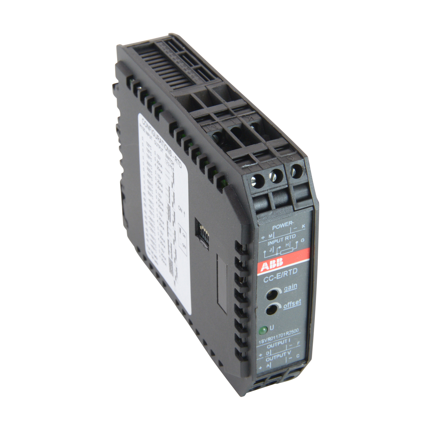 ABB Temperature Signal Converter, Universal, Series: CC-E, PT100 Input, Voltage/Current Output, 0 to 10 V Input, 0 to 10 V Output, 0 to 20/4 to 20 mA Output, 1.5 VA, DIN Rail Mount, 0 to 60 deg C, 10 ms Response, 24 VDC Supply Voltage, 75 mm H x 22.5 mm W