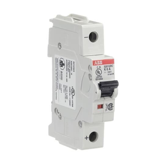 ABB Miniature Circuit Breaker, High Performance, Series: S200UDC, 60/125 VDC, 6 A, 50/60 Hz Frequency, 14 kA Interrupt, K-Curve/Electromechanic/Thermal Magnetic Trip, 1 Pole, Screw Connection, 18 to 4 AWG Wire, IP20 Enclosure, DIN Rail Mounting, -25 to 55 deg C, 71 mm L x 17.5 mm W x 92 mm H Dimensions