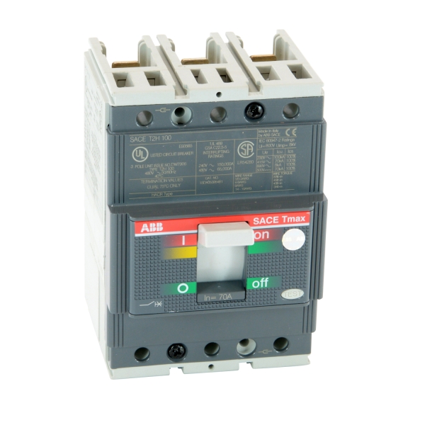 ABB Tmax T2H070TW Molded Case Circuit Breaker, 480 VAC, 70 A, 65 kA Interrupt, 3 Poles, Thermal/Magnetic Trip