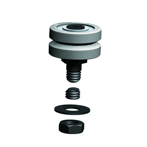 GV3 vee guide wheel for durability and high speed;Twin bearings for improved misalignment tolerance;Size 54 (54mm outer diameter) for use with GV3 Track, NL or L;Through Hole Long Stud mount style - concentric;Metal shield for protection against impacts and debris