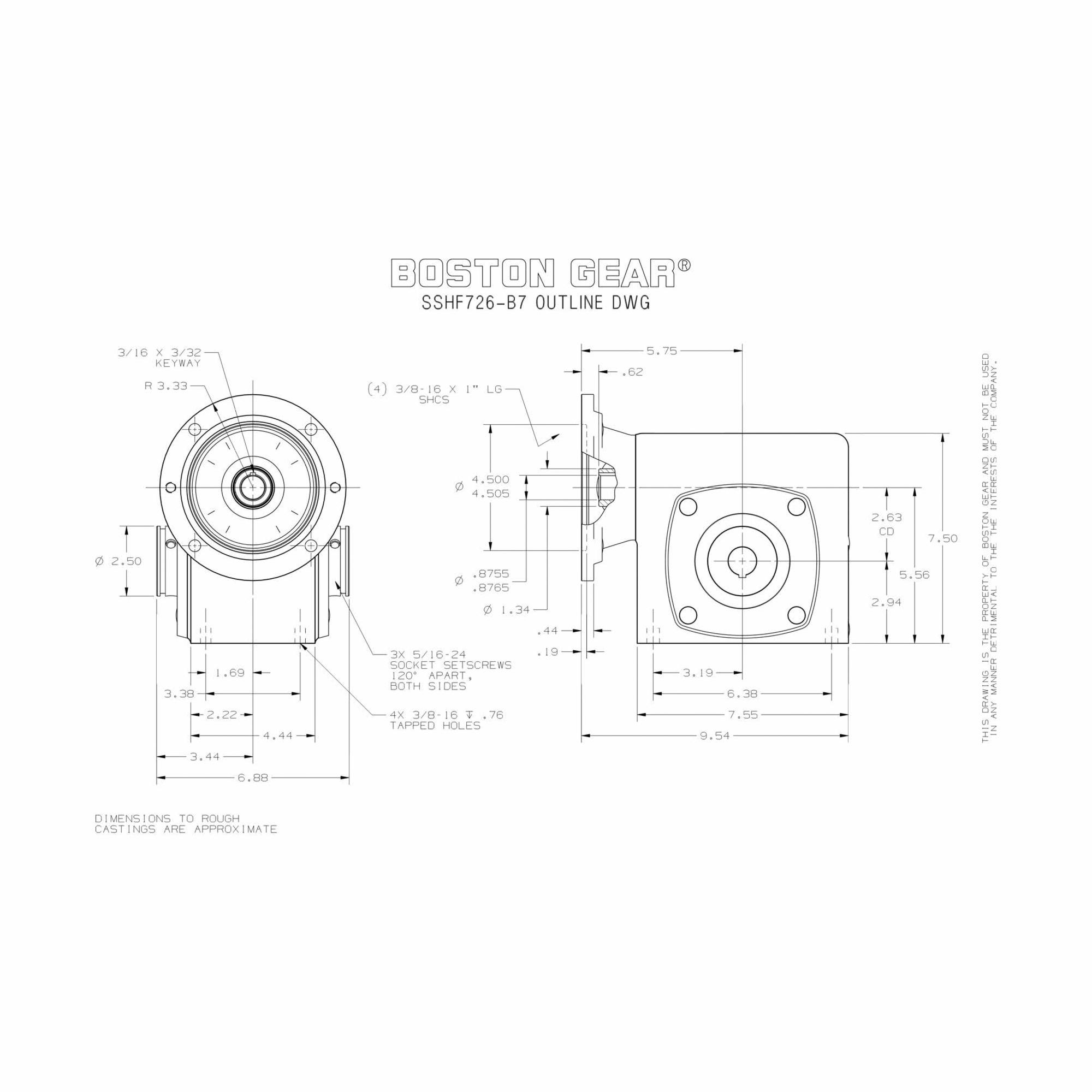Boston Gear® Original Domed Crown™ Right Angle Helical Worm Gear Drive, Single Reduction, Series: SS700, 50:1 Gear Ratio, 1.08 hp Input/0.82 hp Output/1 hp Motor, Quill Flange Input, Hollow Shaft Output, 5/8 in Input, 1-7/16 in Output, 35 rpm Output Maximum Speed, 1750 rpm Input Maximum Speed, 1484 in-lb, 2.62 in Centre Distance, 3/16 x 3/32 in Keyway, 0.76 % Efficiency, Klubersynth UH1 6-460 Lubrication, No Base Mount, Stainless Steel, 7.58 in L x 6.88 in W x 7.5 in H