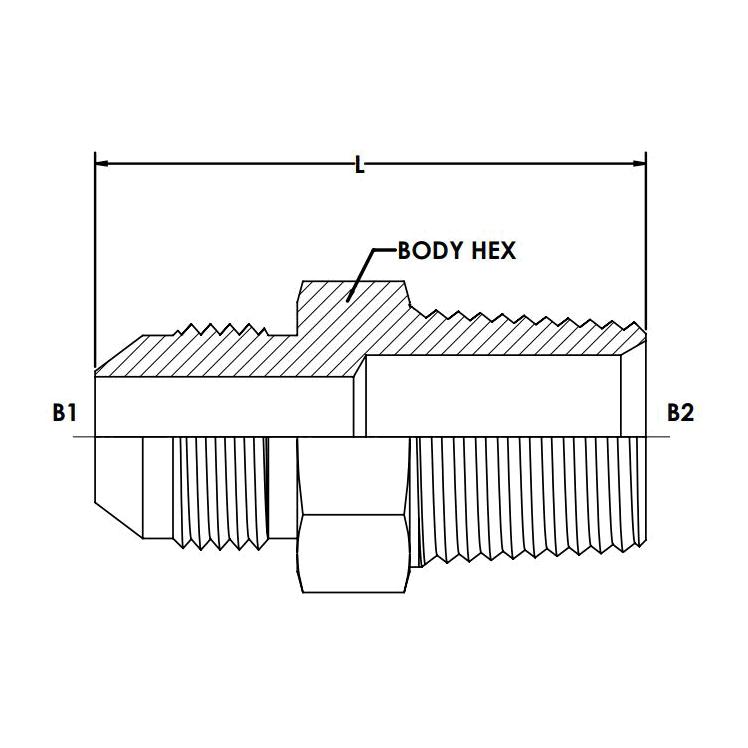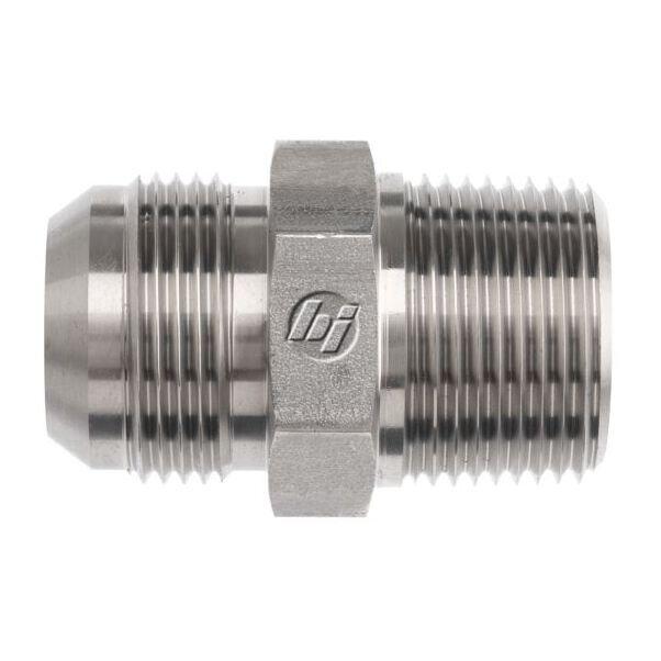 Brennan, 2404-16-24, Hydraulic Adapter, Series: 2404, 1 x 1 1/2 Nominal, Male JIC Flare x Male NPTF End Style, 2 Hex, 2.51 in Length, 3000 psi Pressure, Steel, 2.51 in L Dimensions