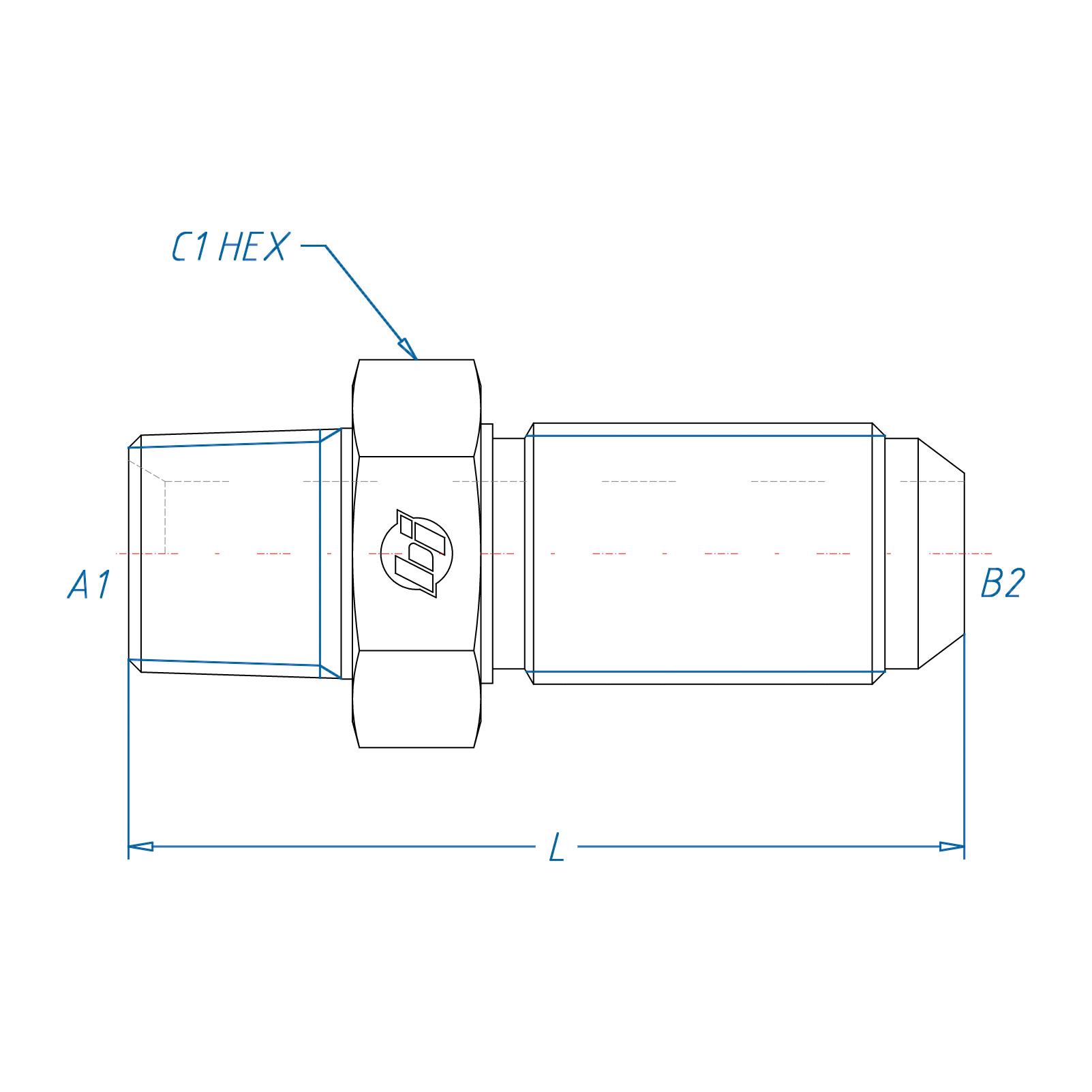 Brennan, 2706-12-12, Hydraulic Adapter, Bulkhead, Series: 2706, 3/4 Nominal, Male NPTF x Male JIC Flare End Style, 1.375 in Hex, 2.920 in Length, 5000 psi Pressure, Steel, 2.920 in L Dimensions