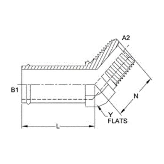 Brennan, 4503-16-16-FG, Hydraulic Elbow, Series: 4503-FG, 1 Nominal, Hose Barb x Male NPTF End Style, 45 deg Angle, 1.312 in Hex, 3.41 in Length, Steel, 3.41 in L Dimensions