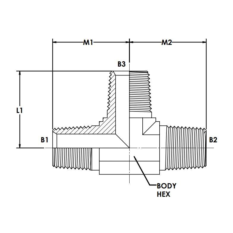 Brennan, 5600-20-20-20-FG, Hydraulic Tee, Series: 5600-FG, 1 1/4 Nominal, Male NPTF End Style, 1.625 in Hex, 4.76 in Length, 3000 psi Pressure, Steel, 4.76 in L Dimensions