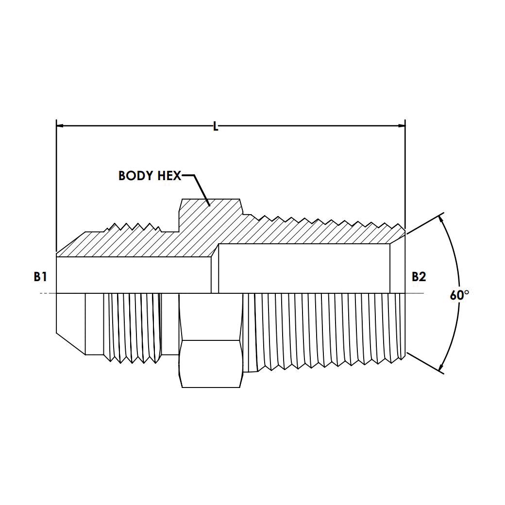 Brennan, 7000-16-16, Hydraulic Adapter, Series: 7000, 1 Nominal, Male JIC Flare x Male BSPT End Style, 35 mm Hex, 58.4 mm Length, 4000 psi Pressure, Steel, 58.4 mm L Dimensions
