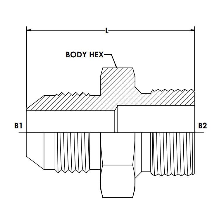 Brennan, 7005-08-20, Hydraulic Adapter, Series: 7005, 1/2 x 1 1/4 Nominal, Male JIC Flare x Male Metric Parallel End Style, 25.4 mm Hex, 38 mm Length, Steel, 38 in L Dimensions