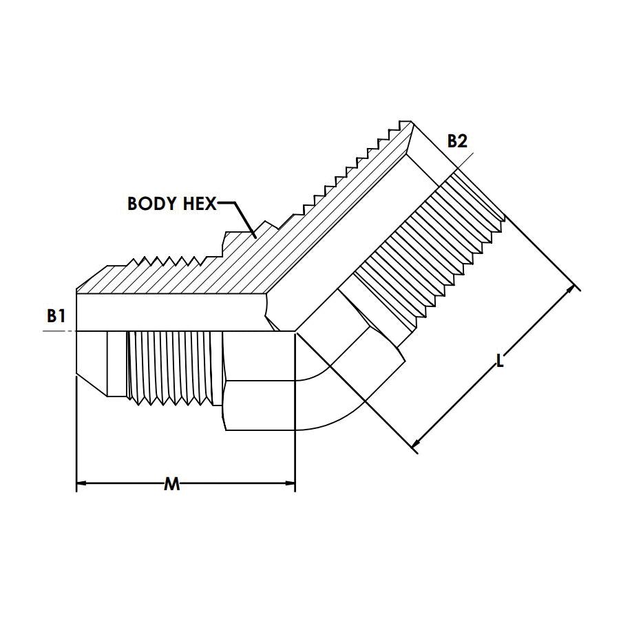 Brennan, 7100-08-08-FG, Hydraulic Elbow, Series: 7100-FG, 1/2 Nominal, Male JIC Flare x Male BSPT End Style, 45 deg Angle, 22 mm Hex, 6000 psi Pressure, Steel