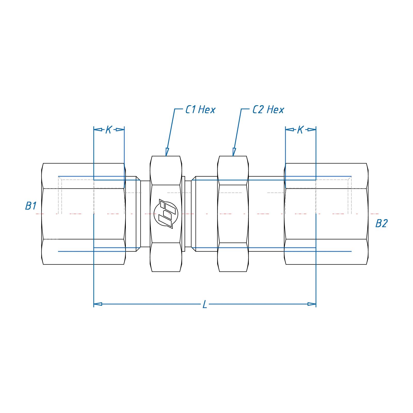 Brennan, C2700-08-08-SS, Hydraulic Union, Bulkhead, Series: C2700, 1/2 Nominal, Bite Type End Style, 1 x 1 in Hex, Stainless Steel