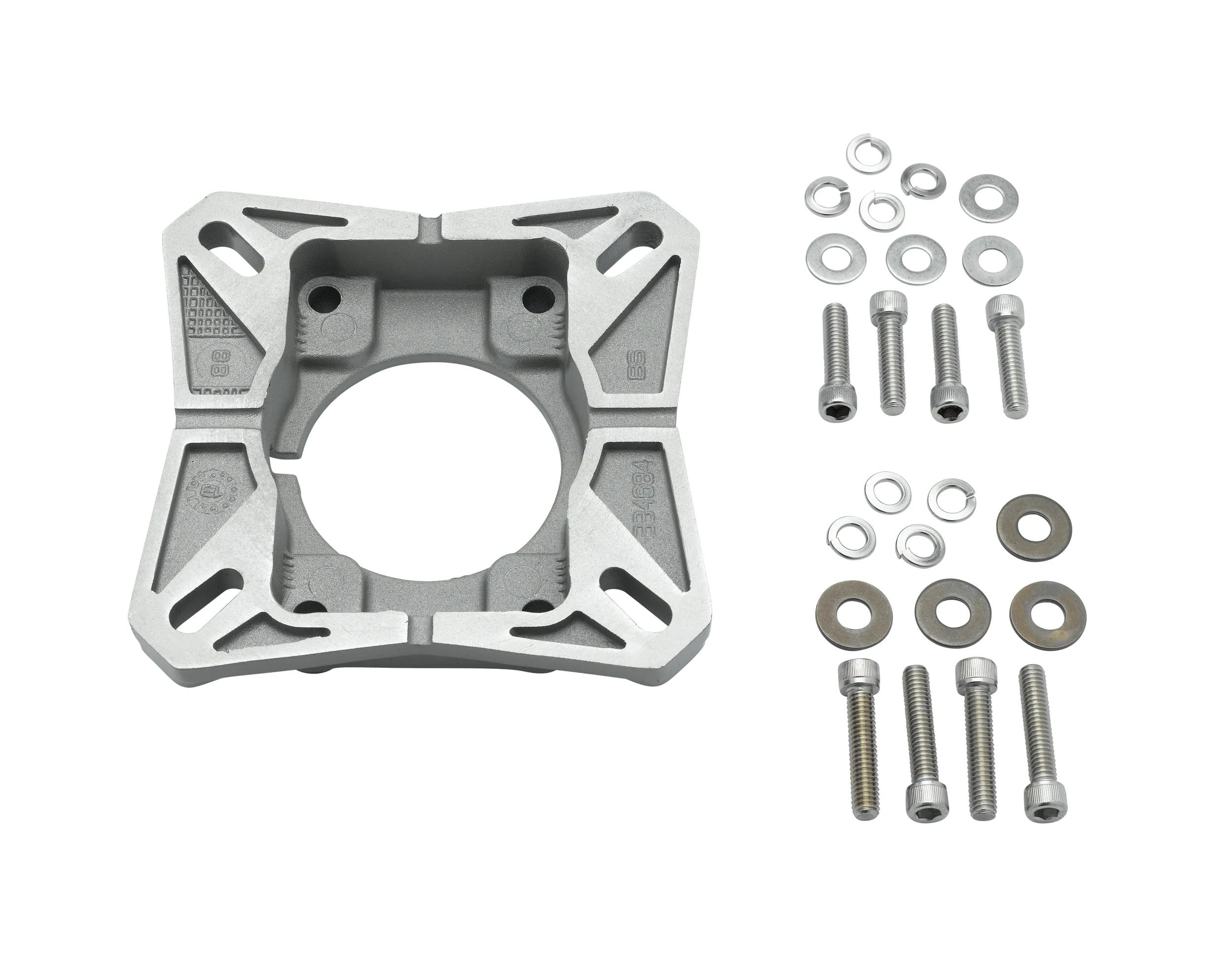 The output cast flange kit is used to mount hollow shaft reducers to a flat surface perpendicular to the output shaft. The flange may be substituted for a tie rod kit to restrain reactions. Each kit consists of a flange and required mounting hardware. The output flange kit can be mounted to either side of a hollow output reducer. When used with Grip Tight® bushings, a single bushing with key must be used and located on the side opposite of the cast output flange.
