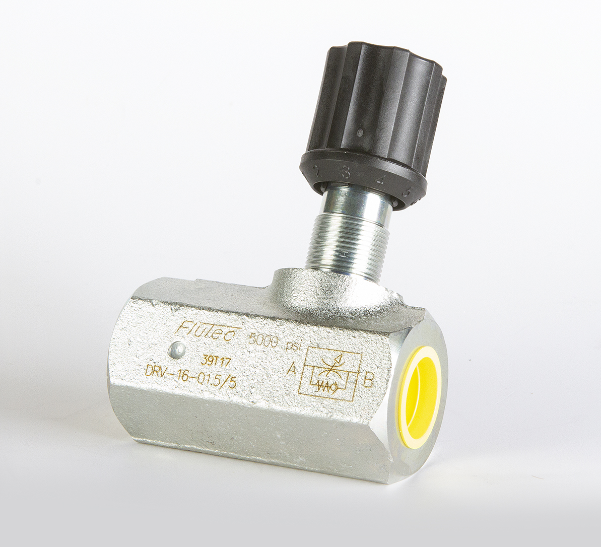 Carbon Steel, Inline Flow Control Valve, SAE-6 (9/16-18 UNF) Ports, Rated to 5,000 PSI, Color Coded spindle for accurate flow control, Zinc Plated