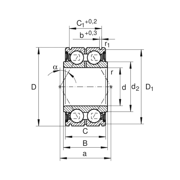 Double-row angular contact ball bearings are units with solid inner and outer rings and ball and cage assemblies with polyamide, brass or sheet-steel cages. Their construction is similar to a pair of single-row angular contact ball bearings in an O arrangement, but they are narrower to a certain extent. They differ in the size of the contact angle and the design of the bearing rings. The bearings are available in open and sealed designs. Due to the manufacturing processes used, open bearings can have turned recesses in the outer ring for seals or shields. Sealed bearings are maintenance-free and therefore facilitate particularly economical bearing arrangements. The angular adjustment facility of angular contact ball bearings is very limited.