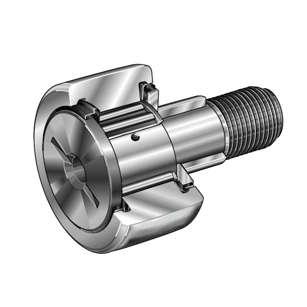 Stud type track rollers are similar in their construction to single and double row yoke type track rollers with axial guidance, except that the raceway is formed by a heavy-section roller stud with a fixing thread and type-dependent mounting aid, and with a type-dependent relubrication facility. Due to the thick-walled outer ring with profiled outside surface and the rolling element set, they can support high radial loads as well as axial loads arising from slight misalignment and skewed running.
