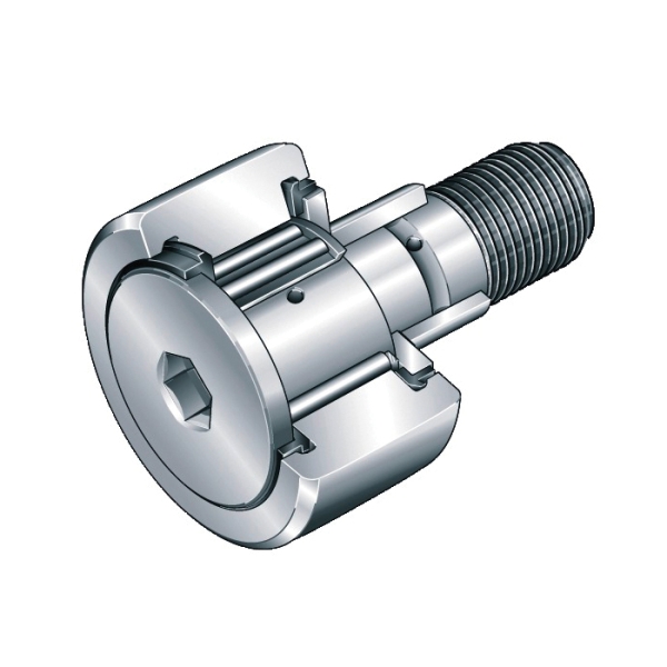 Stud type track rollers are similar in their construction to single and double row yoke type track rollers with axial guidance, except that the raceway is formed by a heavy-section roller stud with a fixing thread and type-dependent mounting aid, and with a type-dependent relubrication facility. Due to the thick-walled outer ring with profiled outside surface and the rolling element set, they can support high radial loads as well as axial loads arising from slight misalignment and skewed running.