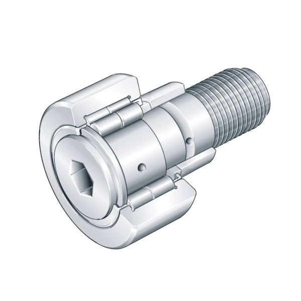 Stud type track rollers are similar in their construction to single and double row yoke type track rollers with axial guidance, except that the raceway is formed by a heavy-section roller stud with a fixing thread and type-dependent mounting aid, and with a type-dependent relubrication facility. Due to the thick-walled outer ring with profiled outside surface and the rolling element set, they can support high radial loads as well as axial loads arising from slight misalignment and skewed running.