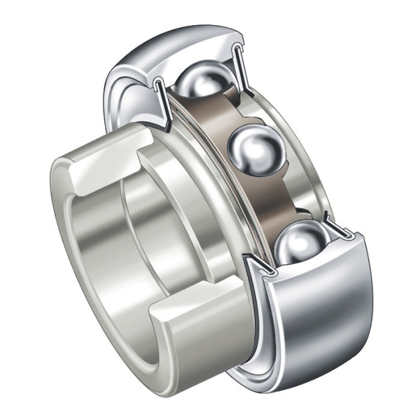 Radial insert ball bearings are single-row, ready-to-fit units comprising a solid outer ring, an inner ring extended on one or both sides, cages made from plastic or sheet steel and seals of type P, R, L or T. Bearings with an inner ring extended on both sides undergo less tilting of the inner ring and therefore run more smoothly. The outer ring has a spherical or cylindrical outside surface. In combination with an INA housing matched to the design, bearings with a spherical outside surface can compensate for misalignment of the shaft.