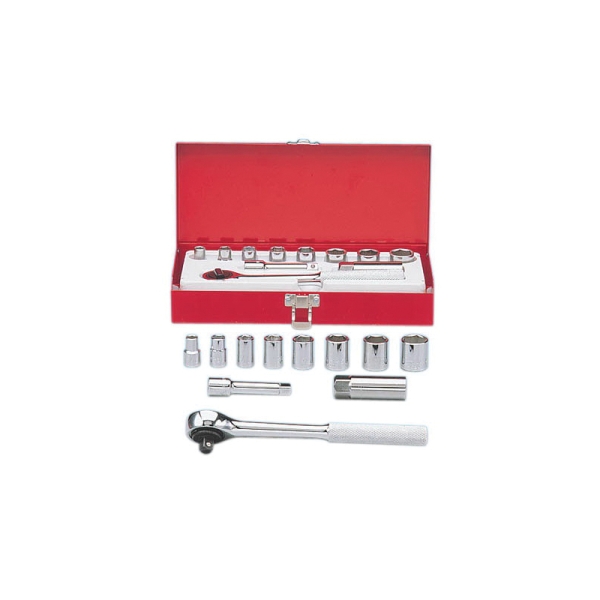 This is a set of 8 chrome standard sockets, with a 6-point opening. The set also comes with a reversible ratchet, 3 in extension, 5/8 in spark plug socket, and a metal box. Hand socket wrenches are drop forged from steel bar. These wrenches are available in drive sizes of 1/4 in, 3/8 in, 1/2 in, 3/4 in and 1 in. These are special purpose wrenches designed for use in a wide range of sizes and capacities. All have square drives and drive size is a measure of capacity. As detachable socket wrenches provide an almost endless combination of handles, attachments and sockets, it is possible to assemble a proper tool for almost any type of service within the tool's capacity.