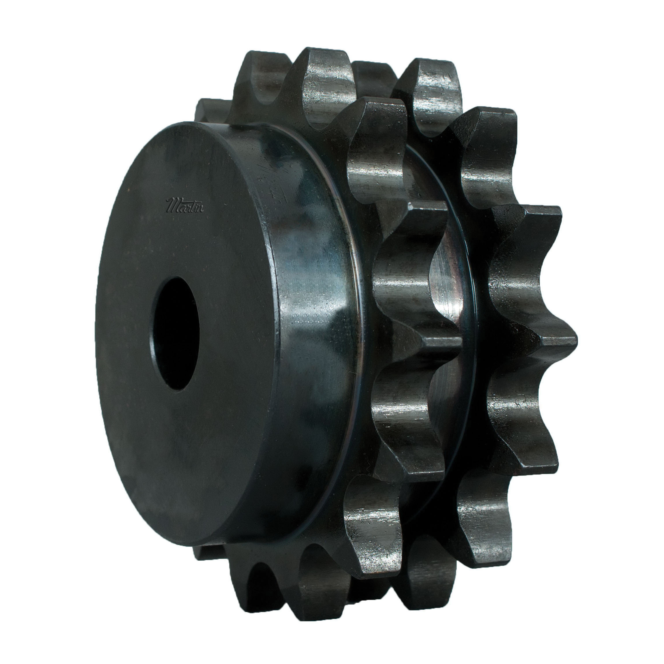Martin double strand solid construction sprockets have proper spacing between chain rows. The sprockets are manufactured from high carbon steel. Martin does not stack "A" plates on multiples, but instead Martin machines teeth after the chain rows are already in place. These plain bore sprockets can easily be bored to a metric or standard size to fit your application. Keyways, setscrews and harden teeth are quick alterations that can be made.