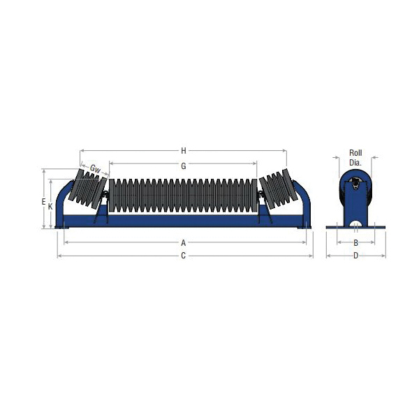 Impact troughing idlers are located at loading and transfer points. The rollers are equipped with rubber discs that cushion the impact and reduce costly belt damage. Impact idler frames are reinforced to reduce bending and withstand heavy material loads.