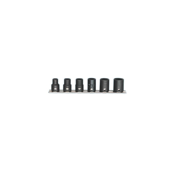 This is a socket set consisting of 6 impact sockets that come on a clip rail. Power/impact socket wrenches are drop forged from steel bar. These wrenches are available in drive sizes of 3/8 in, 1/2 in, 3/4 in, 1 in and 1-1/2 in. These sockets have a 6 point opening. They are available in industrial black finish. These special purpose wrenches are designed for use in a wide range of sizes and capacities. All have square drives and drive size is a measure of capacity. As detachable socket wrenches provide an almost endless combination of handles, attachments and sockets, it is possible to assemble a proper tool for almost any type of service within the tool's capacity.