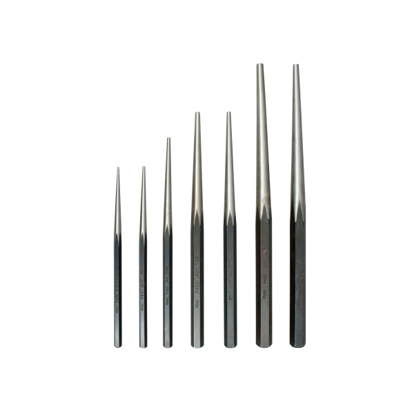This is a set of 7 long taper punches that come in a bag. Long taper punches are drop forged, heat treated, quenched and tempered carbon steel construction. Available in fractional point sizes from 3/32 in through 3/8 in. These are general purpose hand tools with a blunt point and long tapered shank designed for reaching work in hard to get areas, aligning work and sizing holes in light gauge metal and other soft materials.