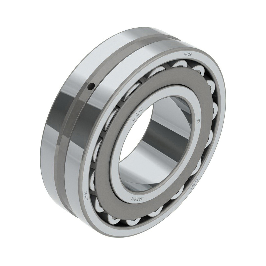 Double-rowed spherical roller bearings are the workhorse of the industry. Their barrel shaped rollers and spherical outer ring raceway permits this bearing to operate with misalignment with no reduction in bearing life. Spherical roller bearings are used mostly in heavy duty industrial applications where extreme radial loads exist. They also excel in handling axial loads in either direction, contaminated environments, misalignment, shock loads and vibration. Nachi Sphericals are manufactured in a number of design and material configurations depending upon the type of application and the size of the bearing. Most come standard with a lubrication groove and holes (W33) on the OD of the outer ring. Symmetrical or Asymmetrical (A) rollers may be used with stamped steel or machined brass cages. The "EX" design uses larger diameter rollers for the highest load ratings. All bearings are heat stabilized to at least 200 deg C (about 400 deg F). Some sizes may be available with tapered bores (K). Depending upon design, stamped steel or machined brass cages are used. Commonly used in gearboxes, wind turbines, pumps, mining/construction, marine propulsion and drilling equipment.