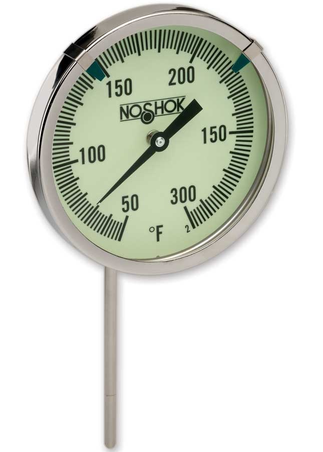 NOSHOK 20-110-040-50/500-F Industrial Thermometer: 2" Bimetal, 1/4" NPT Back Connection. Heavy-duty, weather-resistant design with tamper-proof case. Features a highly sensitive bimetallic helix coil for accurate readings, heat-treated for stress relief, and silicone-coated for minimized pointer vibration. 360-degree groove around the stem provides a visual reference for the minimum immersion point. Available in various sizes with center back connection. Made in the U.S.A.