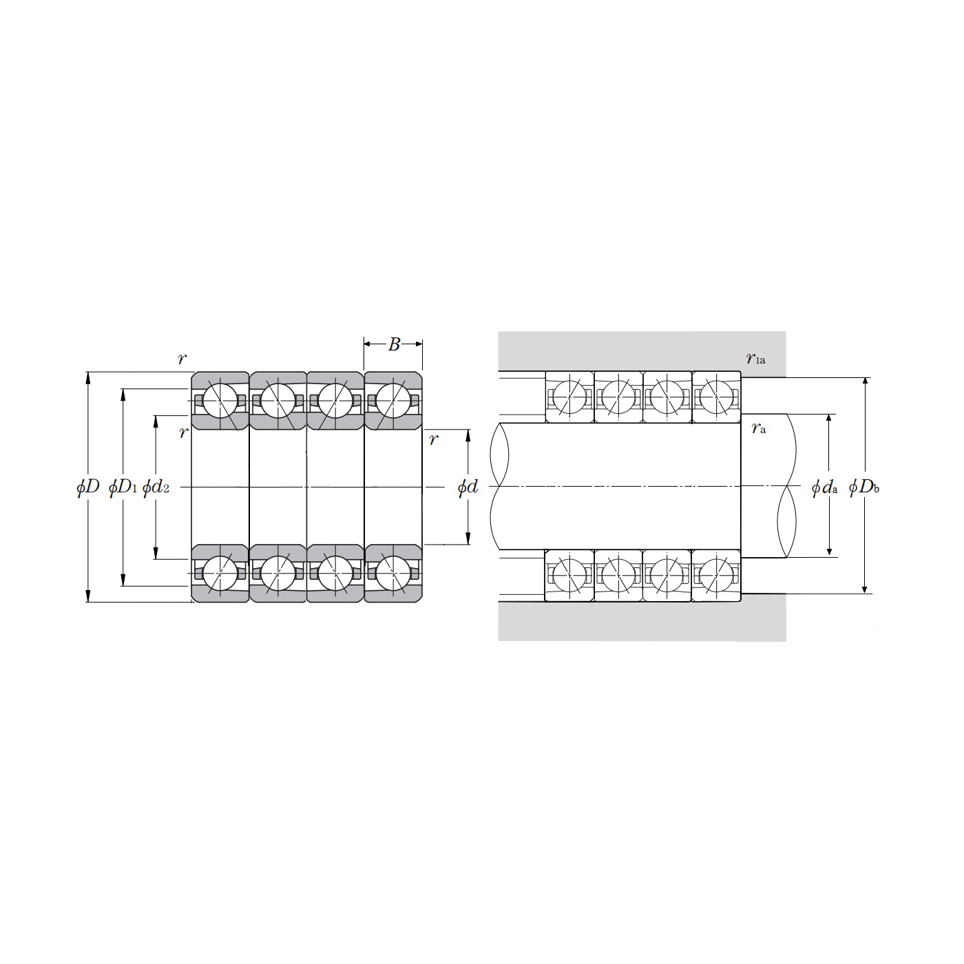Angular contact ball bearings are non-separable bearings which have a certain contact angle in the radial direction relative to the straight line that runs through the point where each ball makes contact with the inner and outer rings. In addition to radial loads, single direction axial loads can also be accommodated by angular contact ball bearings. Furthermore, since an axial load is generated from a radial force, these bearings are generally used in pairs facing each other. Standard type, high speed use type and ultra high speed varieties of angular contact ball bearings are available through NTN, and there are also many duplex varieties. A bearing accuracy of JIS Class 5 or higher is applied to duplex type angular contact ball bearings, and in many cases they are given a preload, in compliance with standard preload levels, before being used in an application.