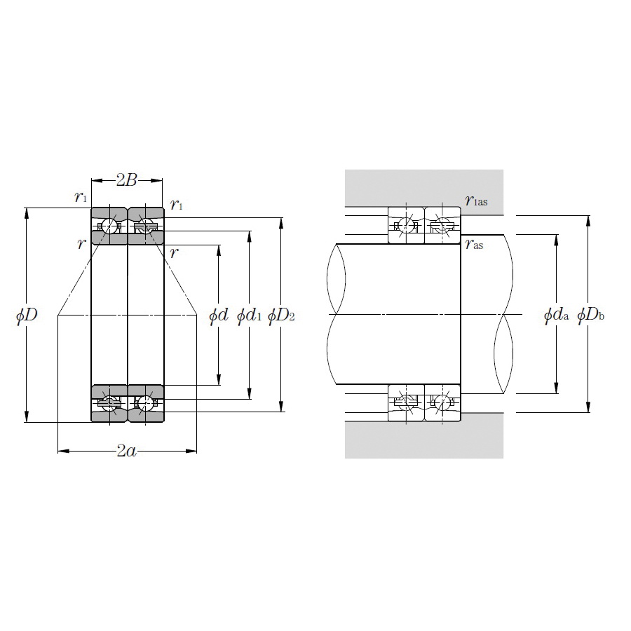 Duplex angular contact ball bearings can be combined in rows of two, three or four bearings to accommodate required specifications. The back-to-back duplex (DB) arrangement and the face-to-face duplex (DF) arrangement allow for the application of both radial loads and axial loads in both directions. The DB arrangement has a wide space between load points and can handle large moment loads. For this reason, this type of duplex arrangement is preferable for use on the main spindles of machine tools.