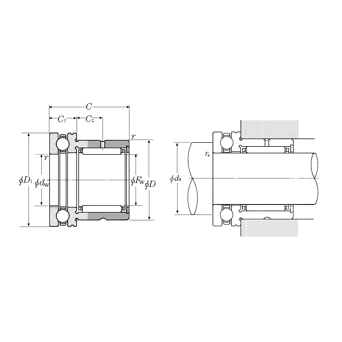 NTN complex bearing is composed of a radial needle roller bearing to support radial load and a thrust ball bearing or a thrust roller bearing to support axial load which are integrated into one bearing unit. Comparing with individual use of a radial bearing and a thrust bearing for the same purpose, this complex bearing saves the required installation space and thereby can contribute to making the overall construction of an equipment more compact.