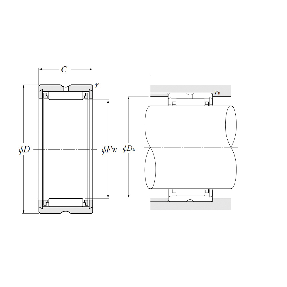 The machined ring of this bearing type contains needle rollers and a cage. The outer ring and the needle rollers are inseparable from each other by means of double-side ribs on the outer ring or side plates. Because of its machined (solid) outer ring enabling to make it more rigid and upgrade the bearing accuracy, this Machined Ring Needle Roller Bearings bearing type is suitable for an application requiring high speed, high load and high running accuracy. These machined ring needle roller bearings are available in two types one without inner ring and another with inner ring considering the case of using a shaft as the direct raceway surface without using inner ring.