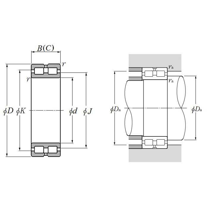 The rollers of the cylindrical roller bearings make line contact with the raceways, these bearings can support heavy radial loads and are suitable for high speed operation. Assembly and disassembly are comparatively easy even if the inner or outer ring requires a shrink fit, as the bearing is a separation type. Cylindrical roller bearings are classified as single row, double row and four row type, according to how many rollers are used, although designed as a thin wall type, the SL Model double row cylindrical roller bearing can support enormous radial and impact loads.