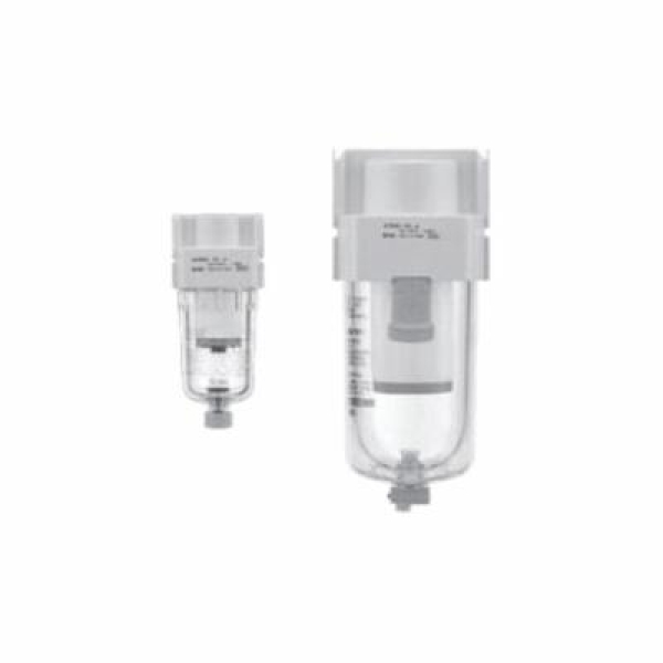 Series AFM modular style mist separator is available in body sizes 20, 30, and 40, and is offered with Rc, NPT or G thread types. The AFM's standard filtration is 0.3um with a 99.9% filtered particle size. Body size 30 and 40 now have a transparent bowl guard that offers 360deg visibility, while completely protecting the bowl from the environment. The modular design allows connection with other SMC air preparation equipment. Use in combination with the AF series to meet your clean room filtration requirements.
