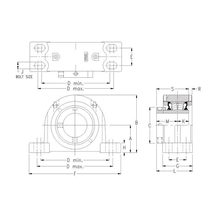 Timken®, QMPF15J215SM, Pillow Block Spherical Roller Bearing Unit, 2-15/16 in Bore, 7.6 to 9.1 in Bolt Center-to-Center Length, 3-1/4 in Base to Bore Centerline, 10.44 in Overall Length, 3.93 in Overall Width, 6.6 in Overall Height, Four-Bolt Base Mounting, Cylindrical Bore, 3.13 in Base Width, Eccentric Locking Device, Triple Lip M Seal, Non-Expansion (Fixed), 49900 lb Dynamic/54100 lb Static Load, 1600 rpm Maximum, Cast Steel, Powder Coated