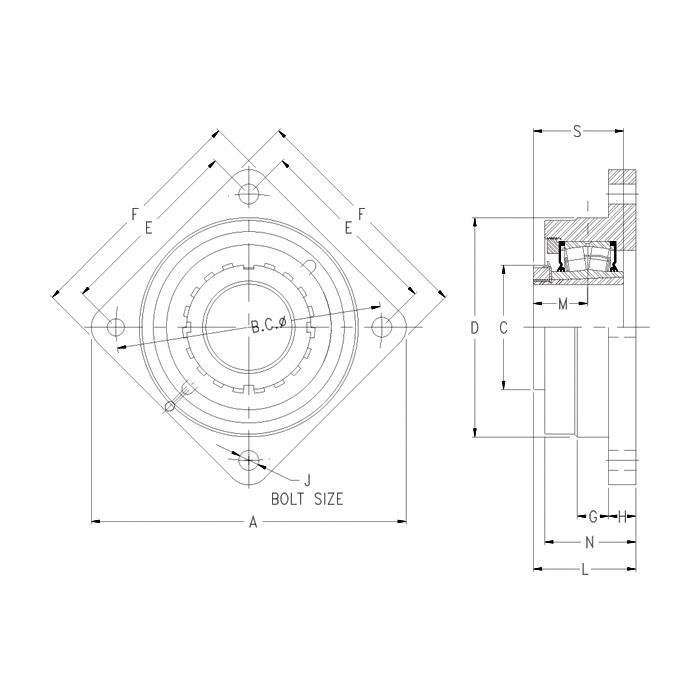 Timken®, TAFB15K208STHT, Spherical Roller Bearing Unit, Heavy Duty Non-Expansion, 2-1/2 in Bore, 6 in Bolt Center-to-Center Length, 8.47 in Diameter Bolt Circle, 4-Bolt Square Flange Mounting, 7.56 in Overall Length/Diameter, 2.9 in Overall Depth, 7.56 in Overall Height, Tapered Adapter Locking Device, Steel Bearing, DuPont® Teflon® Seal, 49900 lb Dynamic/54100 lb Static Load, 2400 rpm Grease/2900 rpm Oil Maximum, -40 to 250 deg F, Powder Coated