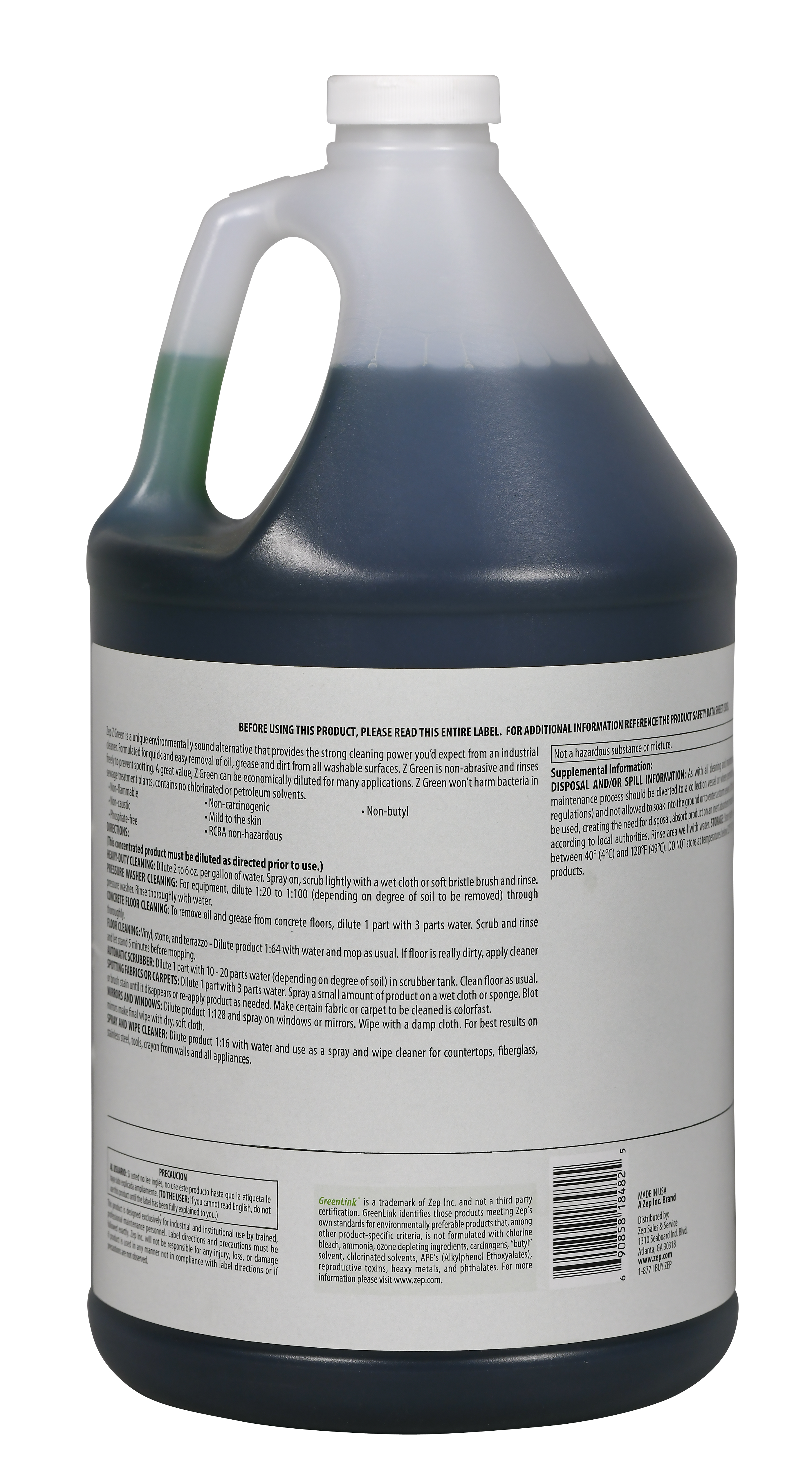 Z Green is a unique, non-toxic, environmentally preferable alternative for cleaning and degreasing. It is formulated for quick and easy removal of oil, grease, and dirt from all washable surfaces. Z Green is non-abrasive and is freely rinsed to prevent spotting, while still providing all the cleaning power you expect from an industrial cleaner and degreaser. Z Green won`t harm bacteria in sewage waste treatment plants, and it does not contain any chlorinated or petroleum solvents. The responsible choice for environmental concerns, water-based Z Green is: non-caustic, non-flammable, phosphate free, non-butyl, non-carcinogenic, a non-hazardous waste by RCRA definition, biodegradable, as well as being mild to the skin. It may be used as a general purpose cleaner, floor cleaner, spray and wipe cleaner, engine degreaser, and for a variety of other cleaning applications. Zep Z Green is a member of the Zep GreenLink line of Environmentally Preferred Products (EPP). This product does not contain any chemicals known to State of California to cause cancer, birth defects, or any other reproductive harm.