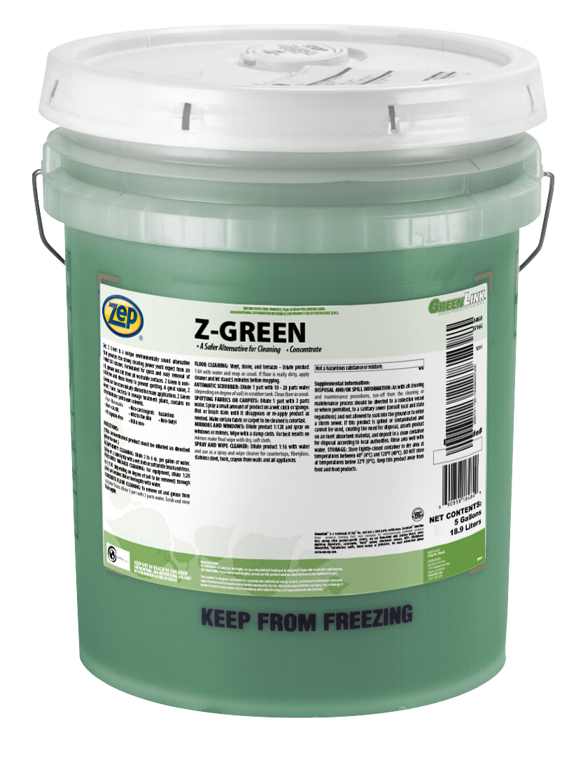 Z Green is a unique, non-toxic, environmentally preferable alternative for cleaning and degreasing. It is formulated for quick and easy removal of oil, grease, and dirt from all washable surfaces. Z Green is non-abrasive and is freely rinsed to prevent spotting, while still providing all the cleaning power you expect from an industrial cleaner and degreaser. Z Green won`t harm bacteria in sewage waste treatment plants, and it does not contain any chlorinated or petroleum solvents. The responsible choice for environmental concerns, water-based Z Green is: non-caustic, non-flammable, phosphate free, non-butyl, non-carcinogenic, a non-hazardous waste by RCRA definition, biodegradable, as well as being mild to the skin. It may be used as a general purpose cleaner, floor cleaner, spray and wipe cleaner, engine degreaser, and for a variety of other cleaning applications. Zep Z Green is a member of the Zep GreenLink line of Environmentally Preferred Products (EPP). This product does not contain any chemicals known to State of California to cause cancer, birth defects, or any other reproductive harm.