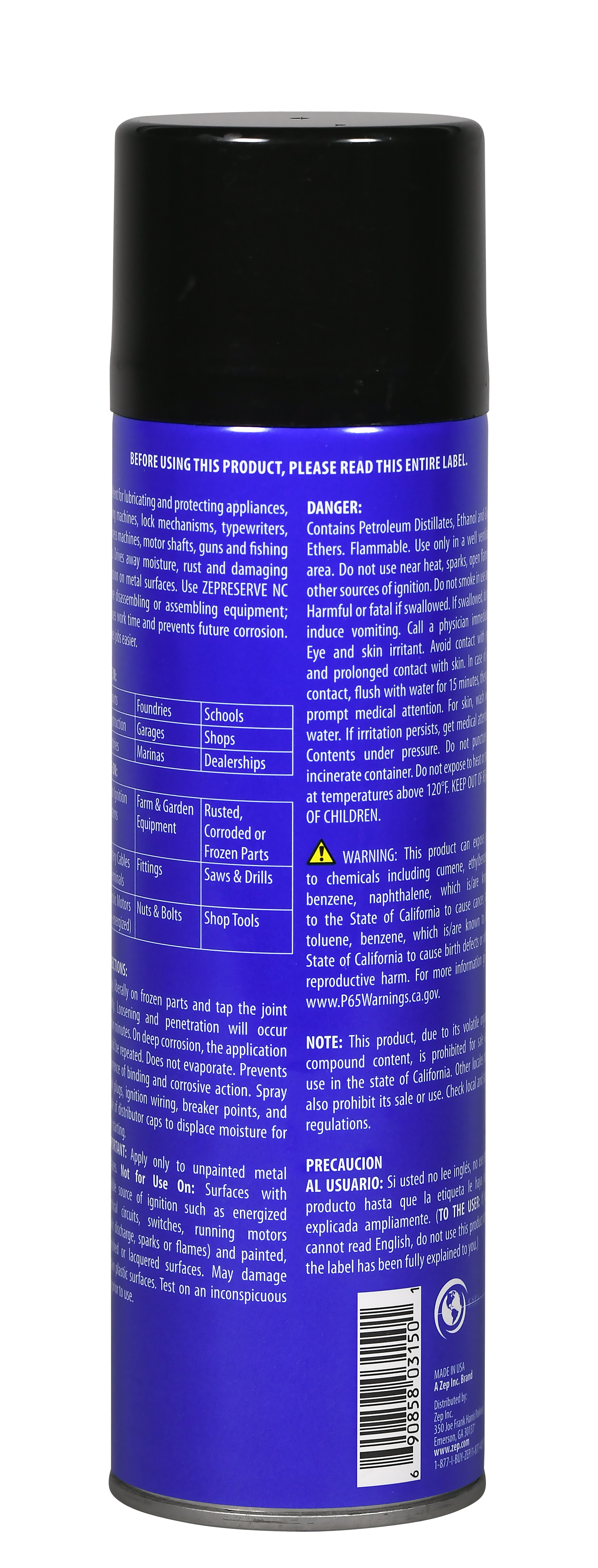 Zepreserve is a penetrant, light-duty lubricant, moisture displacer, and short-term corrosion preventer that loosens rust-frozen parts and provides a protective film to prevent further rusting. It features a blend of corrosion-preventative compounds, penetrating agents and lubricants, dispersed in a solvent medium. It removes grease, graphite, tar and dust and inhibits corrosion of ferrous metals. It displaces moisture and dries electrical components such as automotive distributors, wiring, motors, contact points and switches. The product also works as a light-duty lubricant for gears, chains, slides, and other moving parts. It is perfect for garages, machine shops, factories, assembly plants and construction sites. Zepreserve is also available in 1G, 5G & 55G sizes Proposition 65: This product can expose you to chemicals including cumene, ethylbenzene, which is/are known to the State of California to cause cancer.
