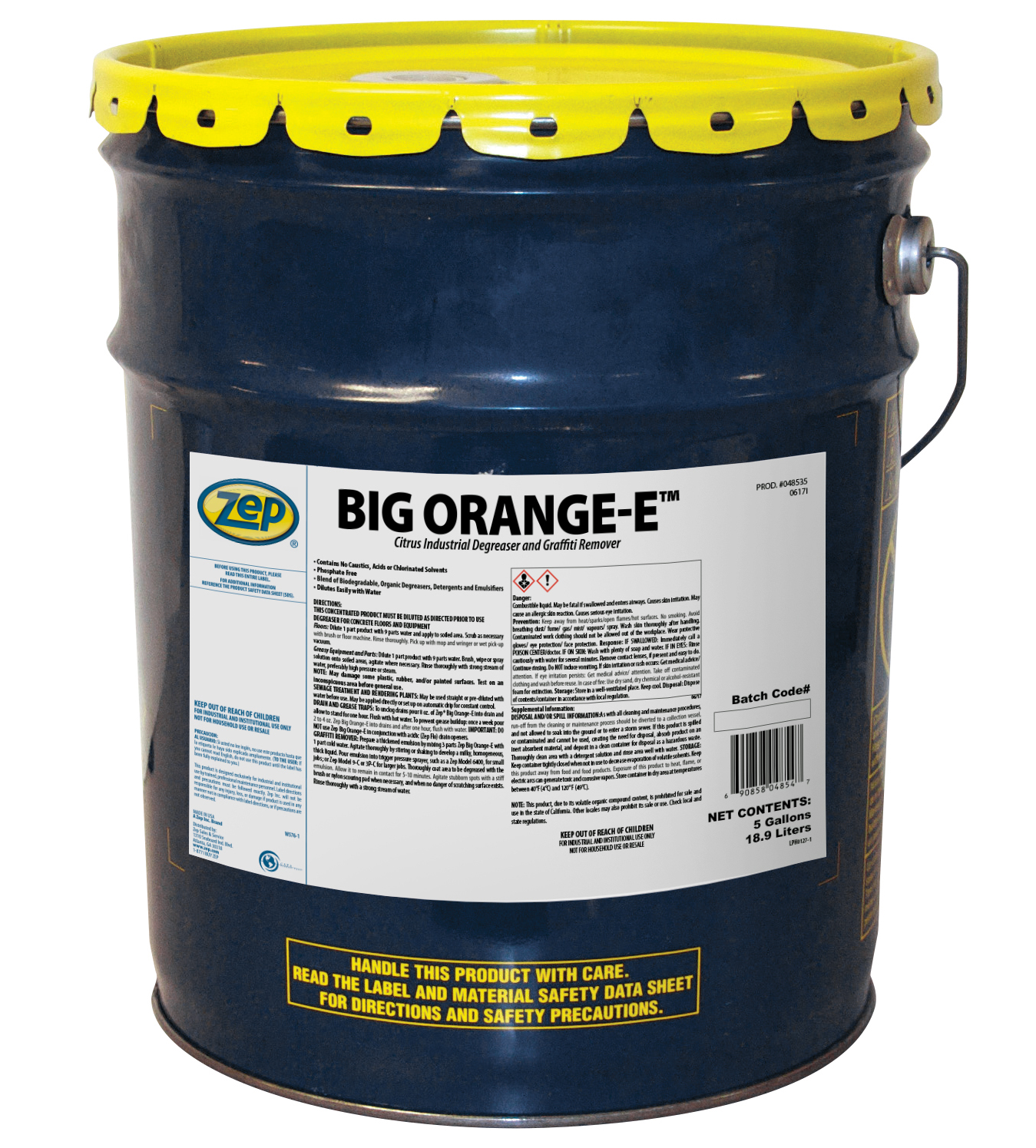Big Orange-E NPE Free is a non-petroleum cleaner, degreaser and deodorizer. It contains natural citrus-based and synthetic biodegradable solvents, which are less hazardous than chlorinated solvents. The product contains no caustics, acids, petroleum distillates, chlorinated hydrocarbons, chlorinated aromatic solvents or APE surfactants. It is suited for cleaning, degreasing and deodorizing drain pipes, grease traps, sewage treatment plants, rendering plants, refuse dumps, trash cans and dumpsters. The biodegradable product quickly penetrates to remove tar, asphalt, tree sap and bug residues and leaves a fresh citrus fragrance with no objectionable petroleum solvent odor. FOR WORKPLACE & INDUSTRIAL USE ONLY Non-petroleum cleaner, degreaser and deodorizer containing natural citrus-based and synthetic biodegradable solvents, which are less hazardous than chlorinated solvents Contains no caustics, acids, petroleum distillates, chlorinated hydrocarbons, chlorinated aromatic solvents or APE surfactants Suited for cleaning, degreasing and deodorizing drain pipes, grease traps, sewage treatment plants, rendering plants, refuse dumps, trash cans and dumpsters Biodegradable product quickly penetrates to remove tar, asphalt, tree sap and bug residues and leaves a fresh citrus fragrance with no objectionable petroleum solvent odor This product does not contain any chemicals known to State of California to cause cancer, birth defects, or any other reproductive harm.