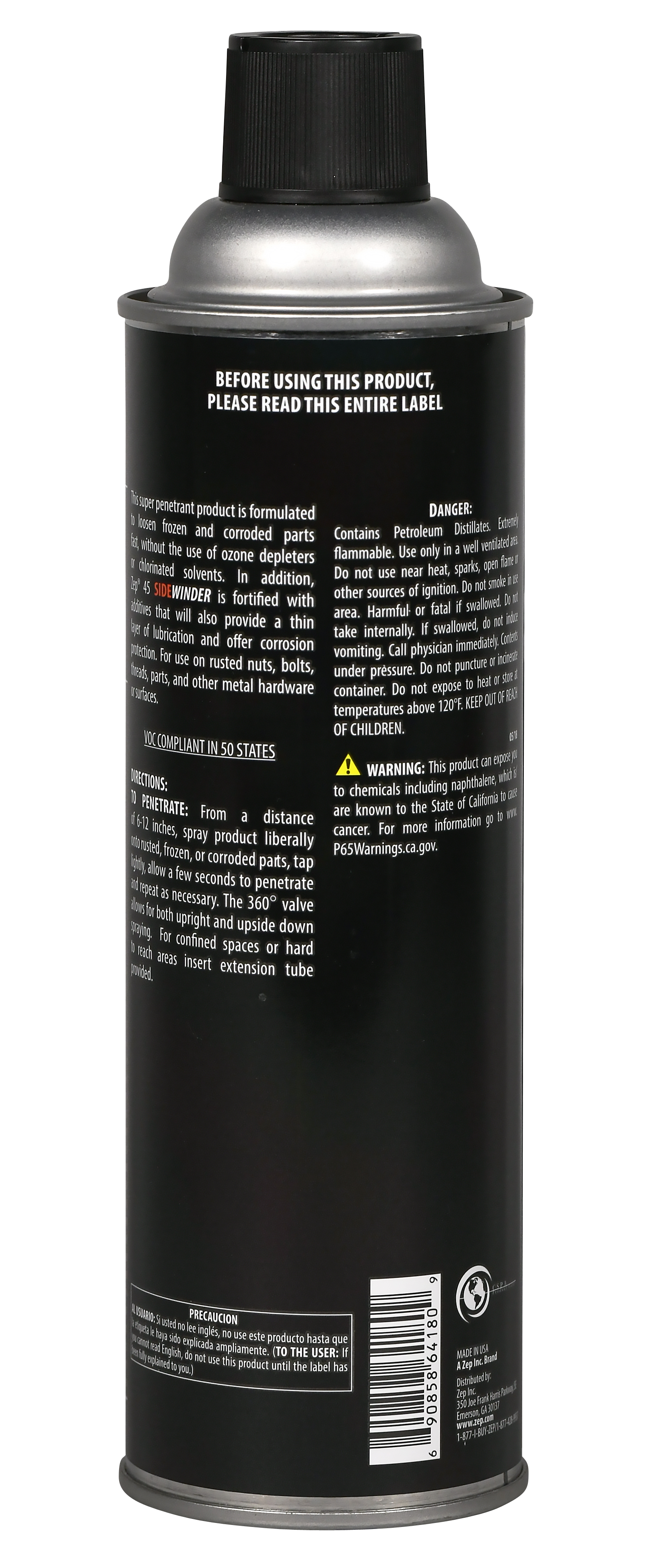 Zep 45 Sidewinder is a superior penetrant that loosens frozen and corroded parts quickly while also providing a thin layer of lubrication and corrosion protection. It is fast spreading and contains no ozone depleters or chlorinated solvents, increasing compliance with regulations. It dissolves grease to help reduce clean-up time on equipment, and helps saves time and money because of its versatility. Its 360-degree valve allows for upright and upside down spraying and includes an extension tube for hard to reach places. Proposition 65: This product can expose you to chemicals including naphthalene, which is/are known to the State of California to cause cancer.