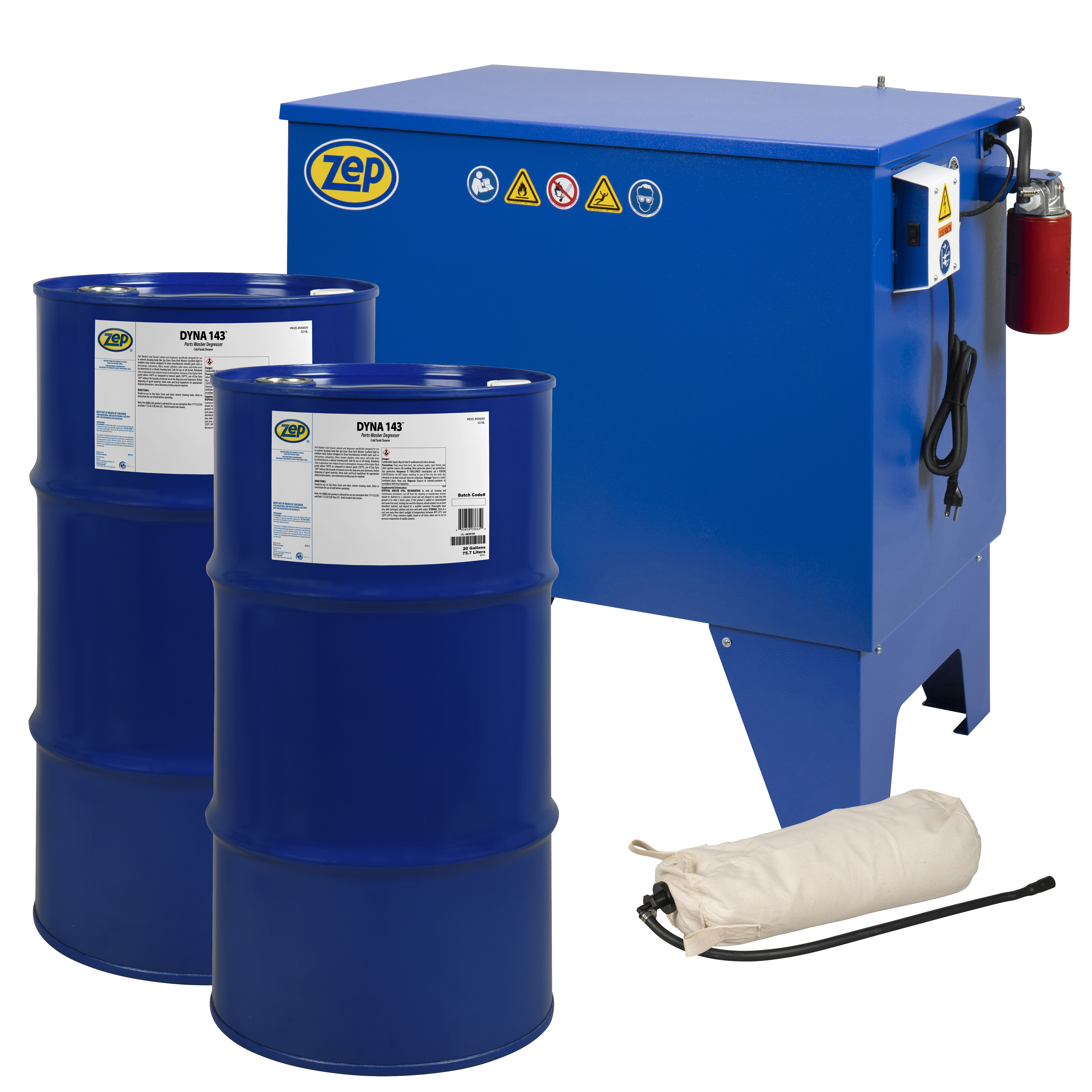 Dyna Brute Intro W/Dyna 143, Includes parts washer, filter, solution Heavy Duty, industrial, automotive parts cleaner. Compliant with Government Freeboard Regulations. 35 Gallon soaking capacity tank that is anchored with heavy duty legs to prevent tipping. Includes Screened sludge filter in soaking tank, Medium side mount filter, removable inside cabinet shelf, metal parts and basket